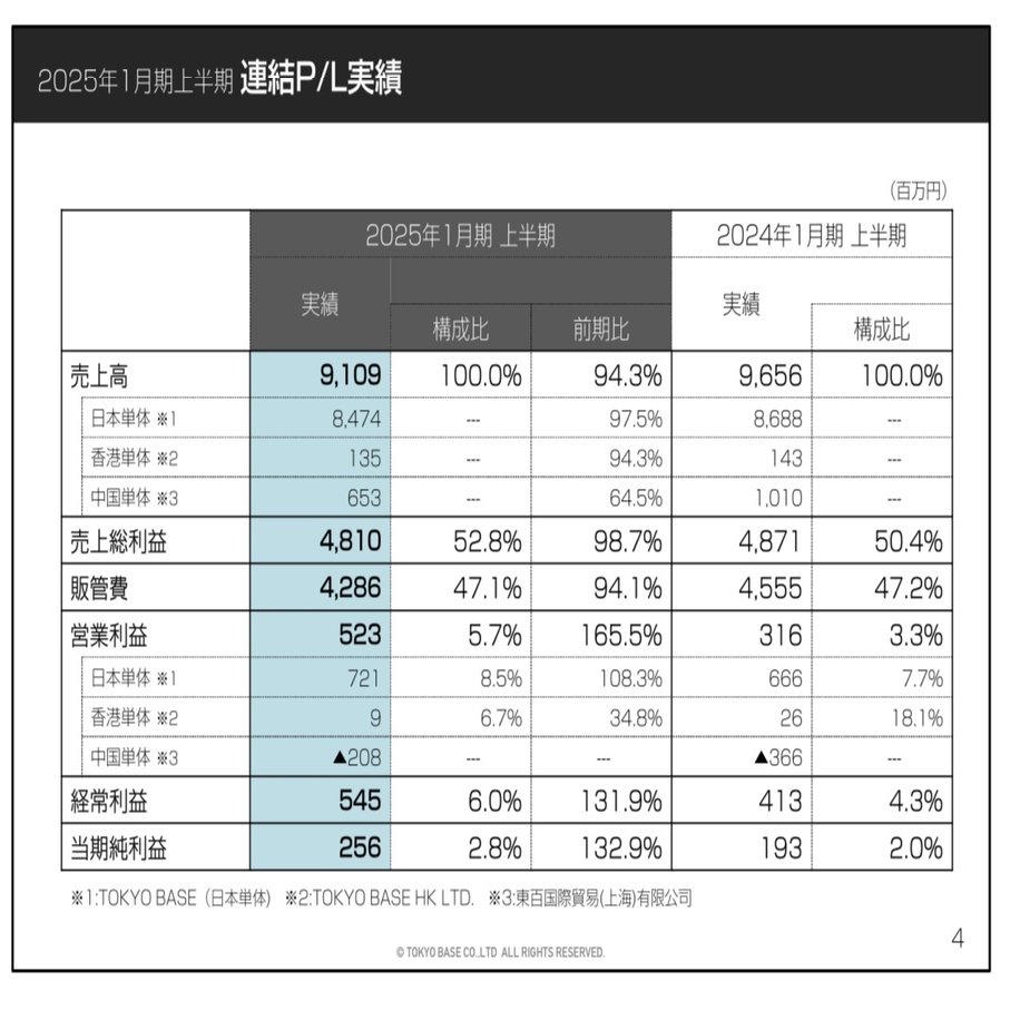 TOKYO BASEの25年1月期上期は減収増益。引き続き中国店舗の撤退等がありトップラインは減少しています。撤退の状況ですが、海外店舗は上期だけで純減4店舗、昨年からは9店舗減っているので減収は致し方無しでしょう。
