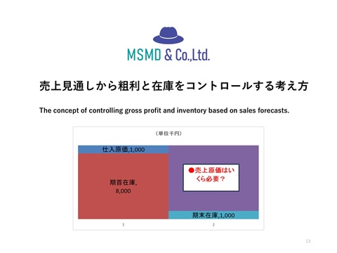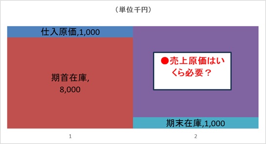 →(期首在庫800万円+期間仕入原価100万円)-期末在庫原価目標100万円=売上原価800万円