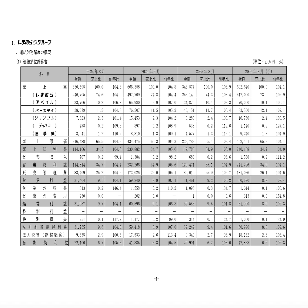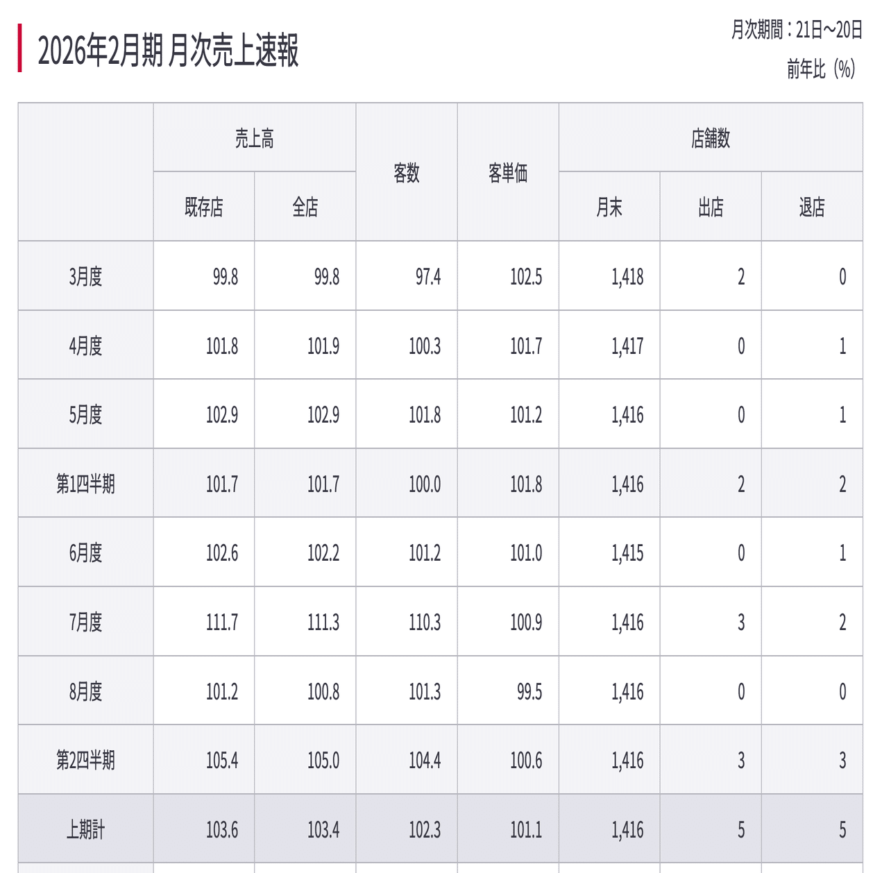 しまむらは全体で粗利率が改善されていますが、こちらはセールを抑制しての改善と記載があります。春夏の在庫消化が進まずセール強化→粗利率低下という状況でもなく(在庫はそれほど増えていません)、販売自体は良好に見えます。月次報告見ても3月のみ昨対割れも、その後は既存含めて全て昨対超え。