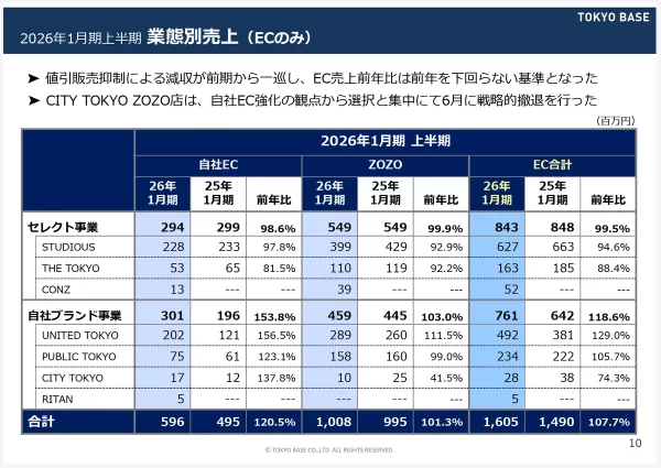 TOKYO BASEは昨年、値引き抑制からZOZOの売上を大きく落としたことで今年度は昨対が取りやすい状況でした。また、全体では伸びているものの、その増加分はUNITED TOKYOが大半を占める状況で、セレクト業態は自社EC・ZOZO双方共に昨対割れです。