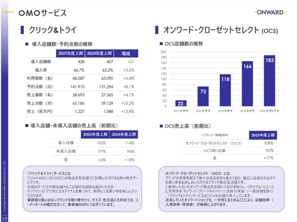 例えばオンワード樫山では数年前から肝となるOMO店舗「オンワードクローゼットセレクト」の展開(上期締めで183店舗)や既存店舗を活用したクリック&トライ。