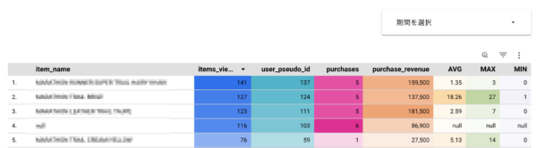 前回の記事でも「露出が少ない割りに売れているアイテムの在庫数を知る方法」については少し触れましたが、技術的なお話をするとこのデータはアイテムスコープなので、アイテムの「閲覧数」「購入数」「収益」と並べる必要があります。
