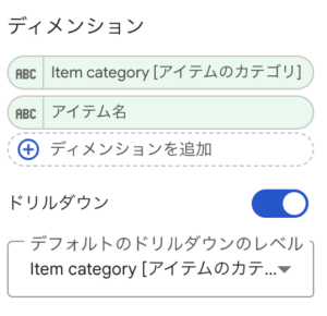 ディメンションはアイテムのカテゴリーとアイテム名を両方選んでおき、ドリルダウンできるようにしておくのがオススメです。(理由は活用方法でご説明いたします。)