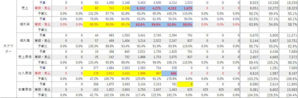 また、期中の消化率(売上原価÷仕入原価)を算出し、数字が振るわない場合の要因を分析することも有効ですが、まずは、先ほど挙げた各項目に沿って話を進めさせていただきます。